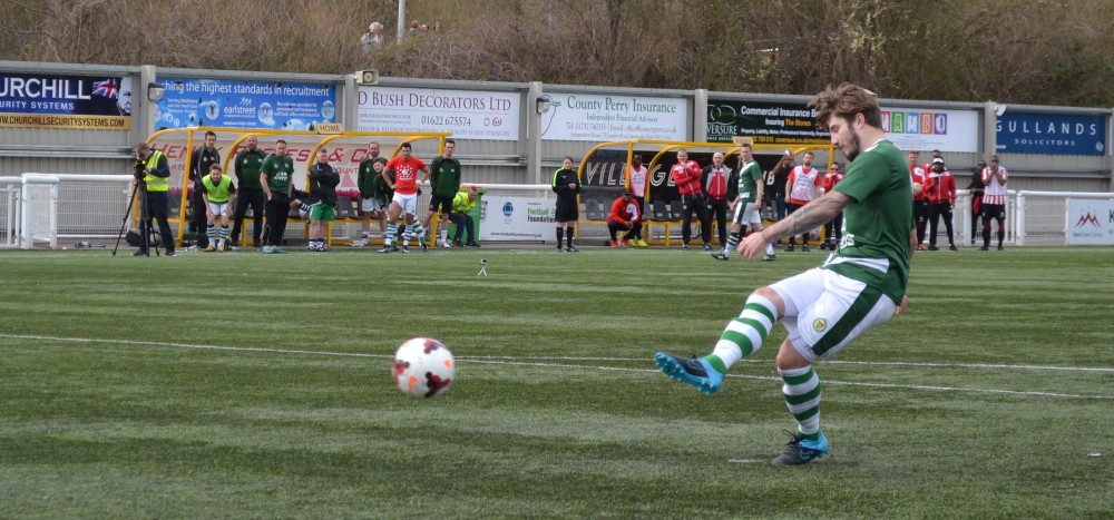 ON THE BRINK: Sheppey United defender John Ralph steps up to score Sheppey United's final penalty.