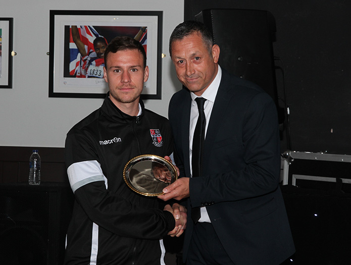 AWARD: Bromley midfielder Jordan Higgs collects one of his player awards from his manager Neil Smith at the clubs presentation night