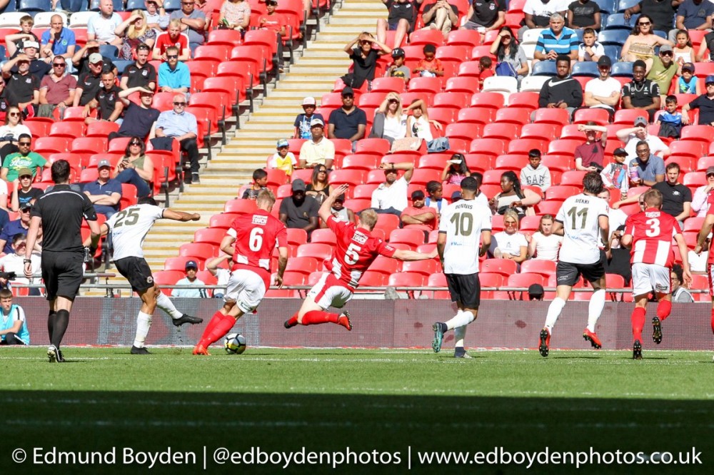 Matt Lowe’s driven shot bounced off the foot of the post and Roger Johnson and Brackley skipper Gareth Dean went to flick the ball in but it was four-time Wembley visitor Johnson who flicked the ball agonisingly rolling into the bottom corner.