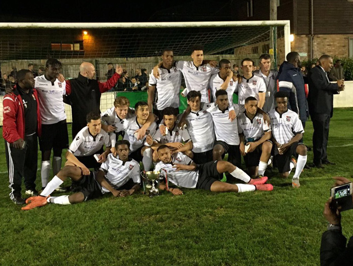 Jamie Leggett guided Bromley’s second year under 18 side to beat Hollands & Blair 2-1 at Corinthian’s Gay Dawn Farm last night to win the Kent Youth League Kit To Fit Challenge Cup Final last night.