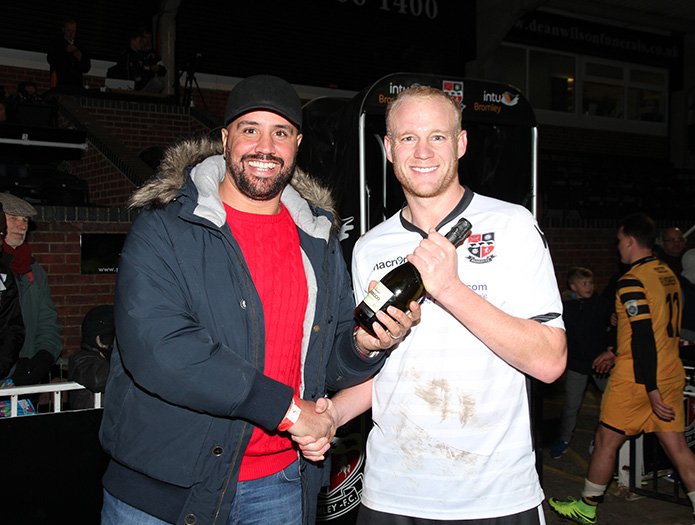 Bromley midfielder Lee Minshull collects the man-of-the-match award after Bromley's 2-0 win over Maidstone United in the Vanarama National League on 3 December 2016.