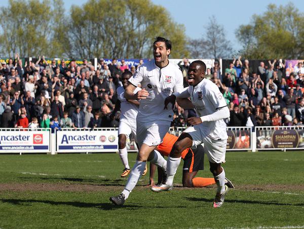 GOING UP: Jamie Slabber (left) celebrates scoring Bromley's third goal against Weston-super-Mare which sealed the Vanarama Conference South title on 18 April 2015.