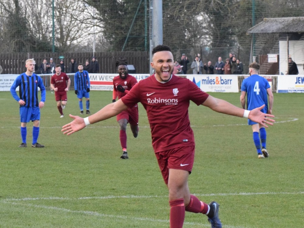 Dean Grant celebrates scoring Canterbury City's second goal that sent them through to The FA Buildbase Vase Quarter-Finals after beating Leicester Nirvana at Salters Lane.