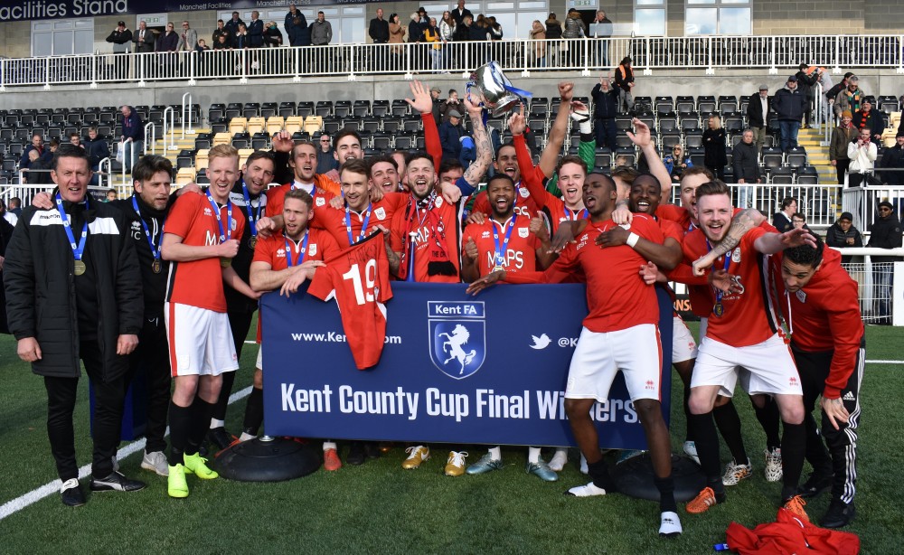 Chatham Town celebrate winning the Kent Senior Trophy for the first time after beating their league rivals Beckenham Town with Michael Hagan's extra-time goal. Captain Paul Vines lifts the silverware and a number 19 shirt with Steve Binks' name on the back, to pay tribute to the club stalwart who sadly passed away earlier on in the season.