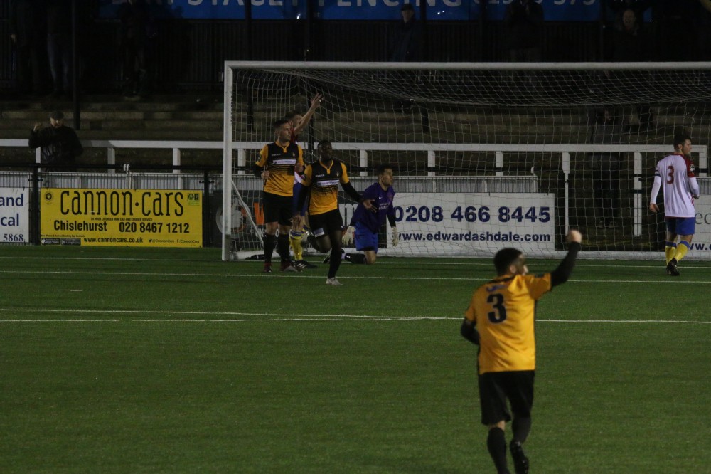 Cray Wanderers' versatile player Ben Mundele (second left) turns away to celebrate after scoring his side's second goal against Sittingbourne.