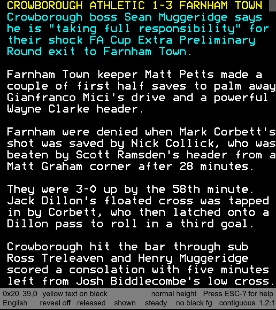 But Farnham Town should have taken the lead when Cardona spun his marker on the edge of the Crowborough penalty area and played in Corbett, who stroked his shot towards the bottom far corner from 10-yards, where a quick-thinking Collick rushed off his line to smother the shot, low to his left.