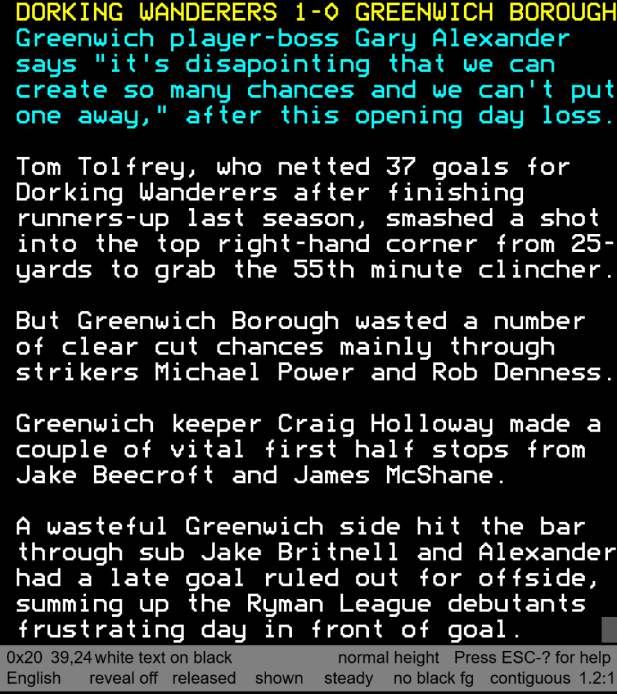 Peter Sweeney played both corners short to Eisa, who cut inside on both occasions and Dyett made two brilliant headed goal-line clearances to prevent Greenwich Borough scoring their first goal in the Ryman League.