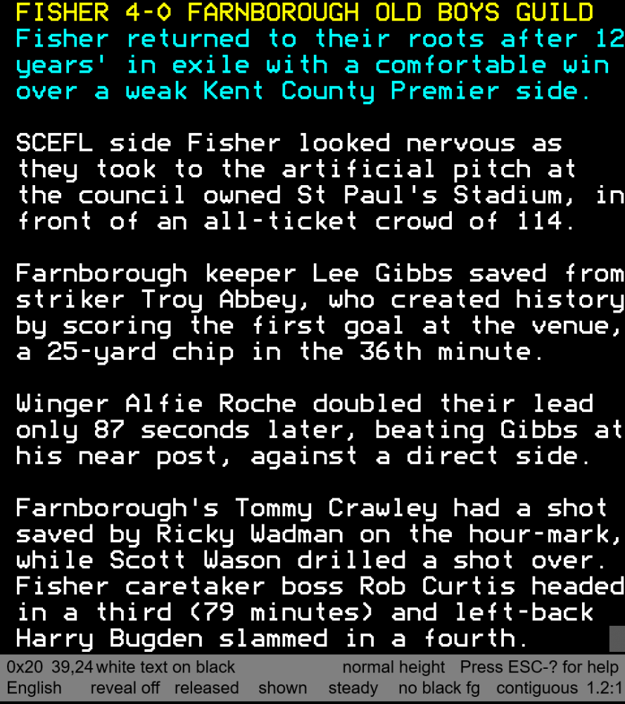 Fisher linked up well inside Farnborough’s half with Jamie Taylor, Alfie Roche, Wilson and John Ufuah and Abbey’s left-footed drive from 25-yards brought another comfortable save from Gibbs.