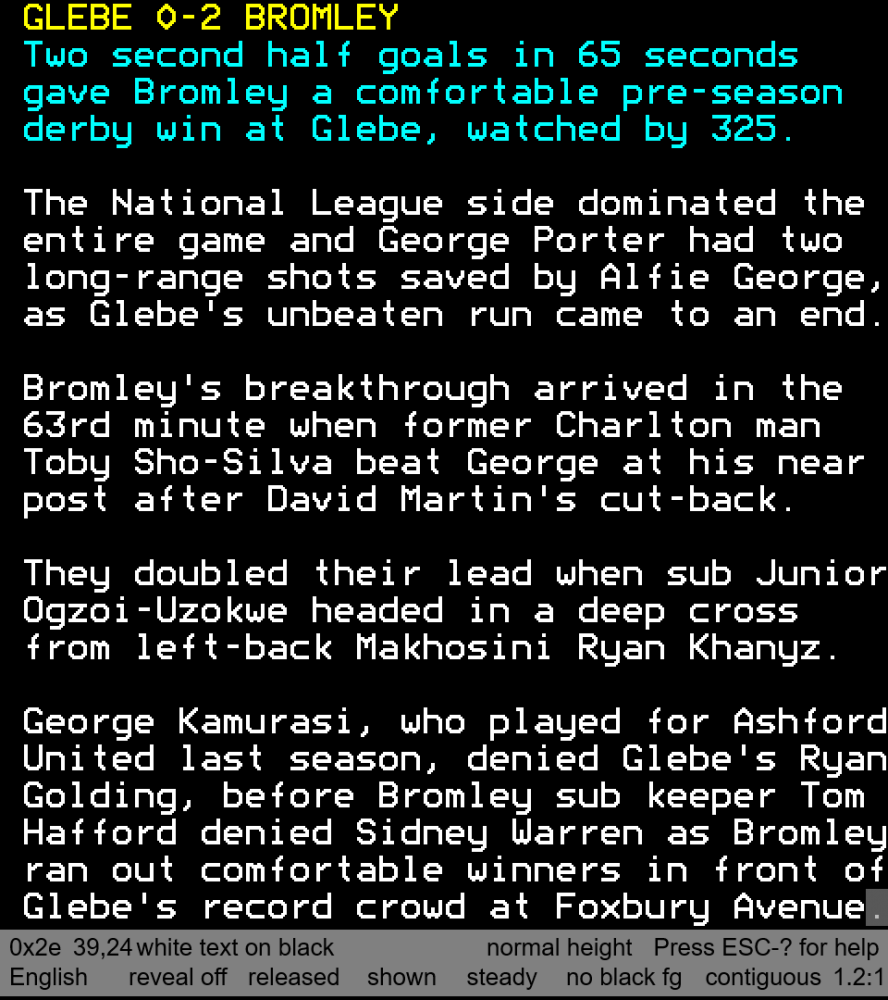 Right-winger Reece Simpson smashed his free-kick high over the Glebe crossbar and striker Sam Afolabi dragged his shot wide after Bromley linked up well down the left with Ogzdi-Uzokwe, Chidi-James Williams-Agunabor and Dan Ajakaiye.