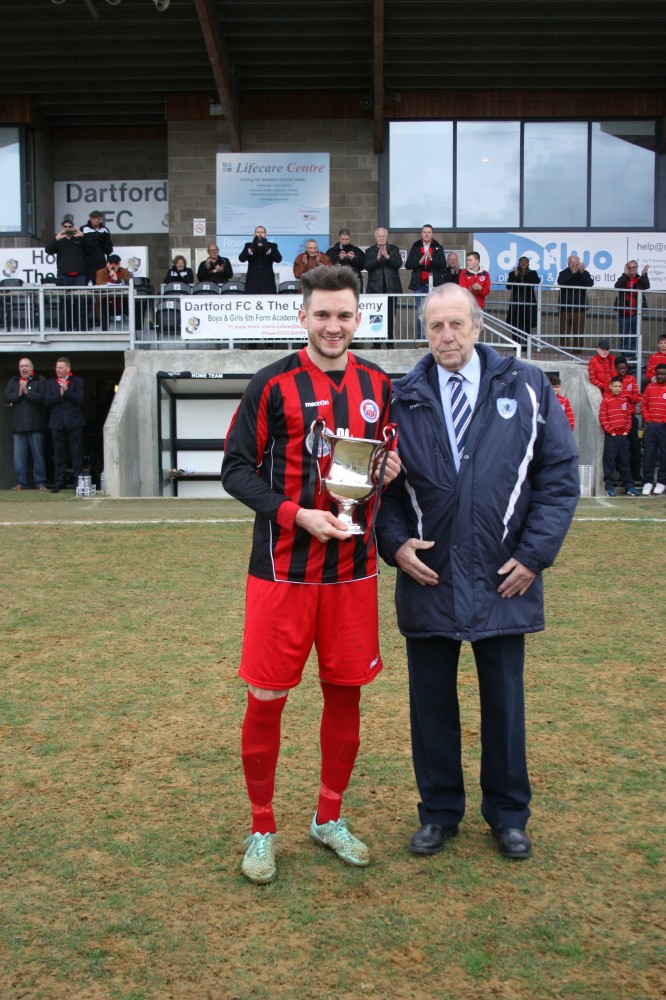 CHAMPIONS: Greenwich Borough captain Danny Young receives the Southern Counties East Football League champions trophy from Ray Brown.