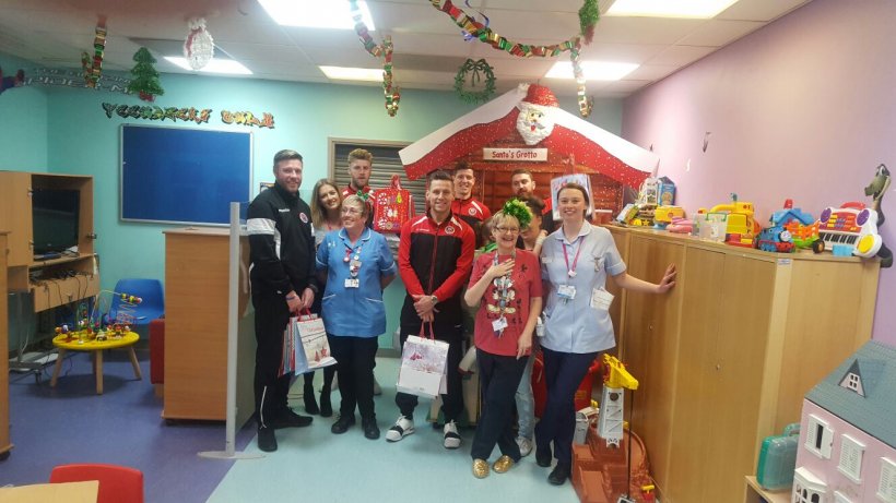 LIONHEARTED: Greenwich Borough manager Gary Alexander (left) and members of his playing staff distribute Christmas presents to children and staff at Queen Elizabeth Hospital, Woolwich. The club donated books and CDs after raising £618 at their games over the past couple of months to bring Christmas cheer to kids staying in The Tiger and Safari Ward at the hospital.
