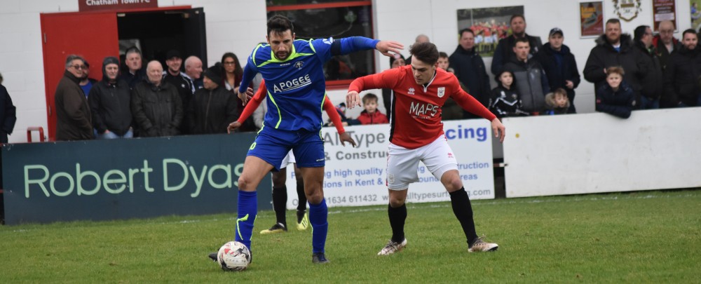 Rob Denness (blue) made his return to Hollands & Blair yesterday but the striker couldn't prevent his side going down to a 2-0 defeat to local rivals Chatham Town in the Kent Senior Trophy Semi-Finals.