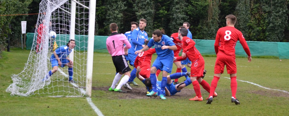 FOUL: Hollands & Blair striker Rob Denness (falling red shirted player beside goalkeeper Craig Holloway) had an early headed goal ruled out for a foul.