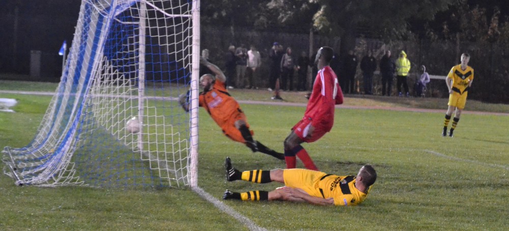 Lewisham Borough’s other central midfielder Alan Robinson hit a speculative long-range drive towards goal, which deflected into the hands of Kamurasi, who stepped to his right initially but had time to compose himself to make a low save.
