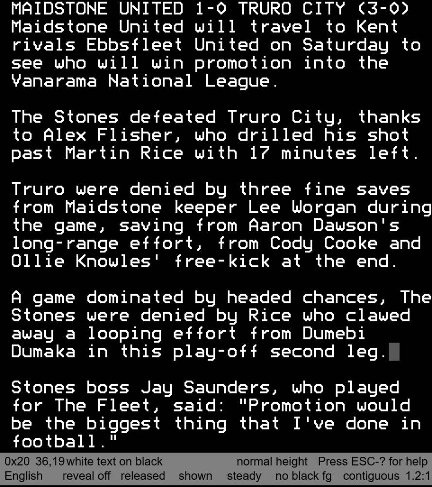 This goal killed off Truro City’s promotion hopes and Maidstone United created yet another headed chance when substitute Dan Sweeney powered his header over following Flisher’s corner from the left.