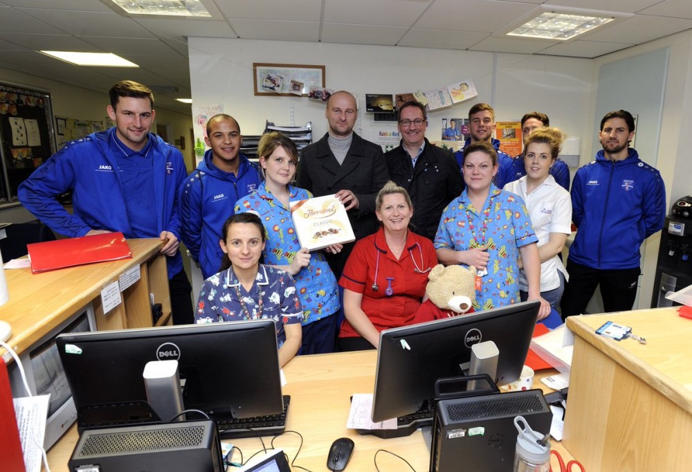 Manager Steve Watt, chairman Alistair Bayliss and players Frannie Collin, Liam Friend, James Rogers, Ben Swift and Ben Wynter handed out goody bags to the kids spending Christmas on the Rainbow Ward.