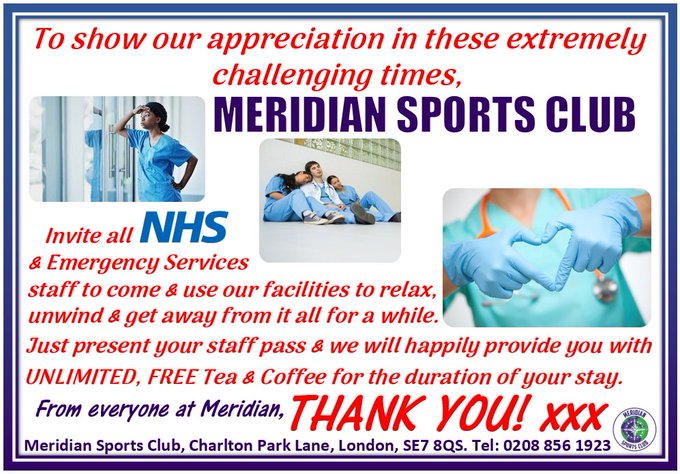 “With our NHS and Emergency Services staff currently being pushed to their limits, Meridian Sports Club would like to offer our facilities and unlimited free tea and coffee to our valuable, hard-working angels. We are extremely grateful for all you are doing,” said a statement from the venue.