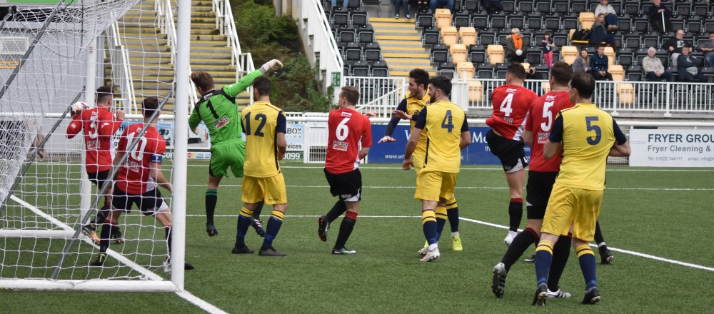 Whitstable Town set the tone as another long ball was played into the box, Welford knocked the ball down and Walker drilled his right-footed shot into the side netting after only 33 seconds.