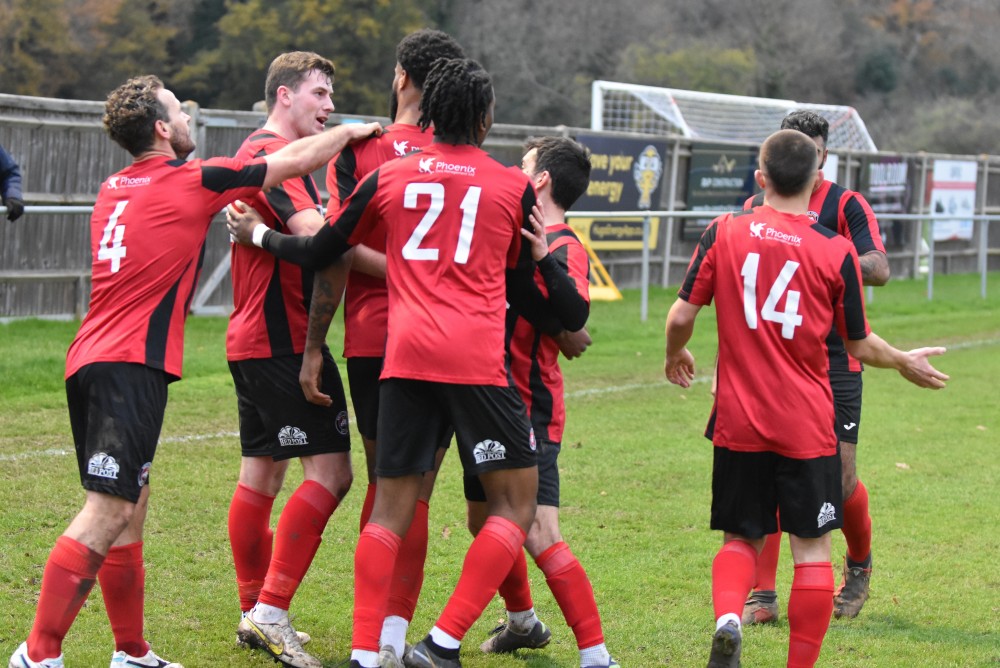 GOAL: Erith Town celebrate Harry Taylor's (second from left) first goal as the Dockers booked their place in The FA Vase Fourth Round for the first time.