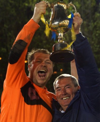 WINNERS: Stansfeld Oxford & Bermondsey Club keeper James Bradley (left) lifts the Bill Manklow Inter-Regional Challenge Cup afer his side's 2-0 win over Farnborough Old Boys Guild.