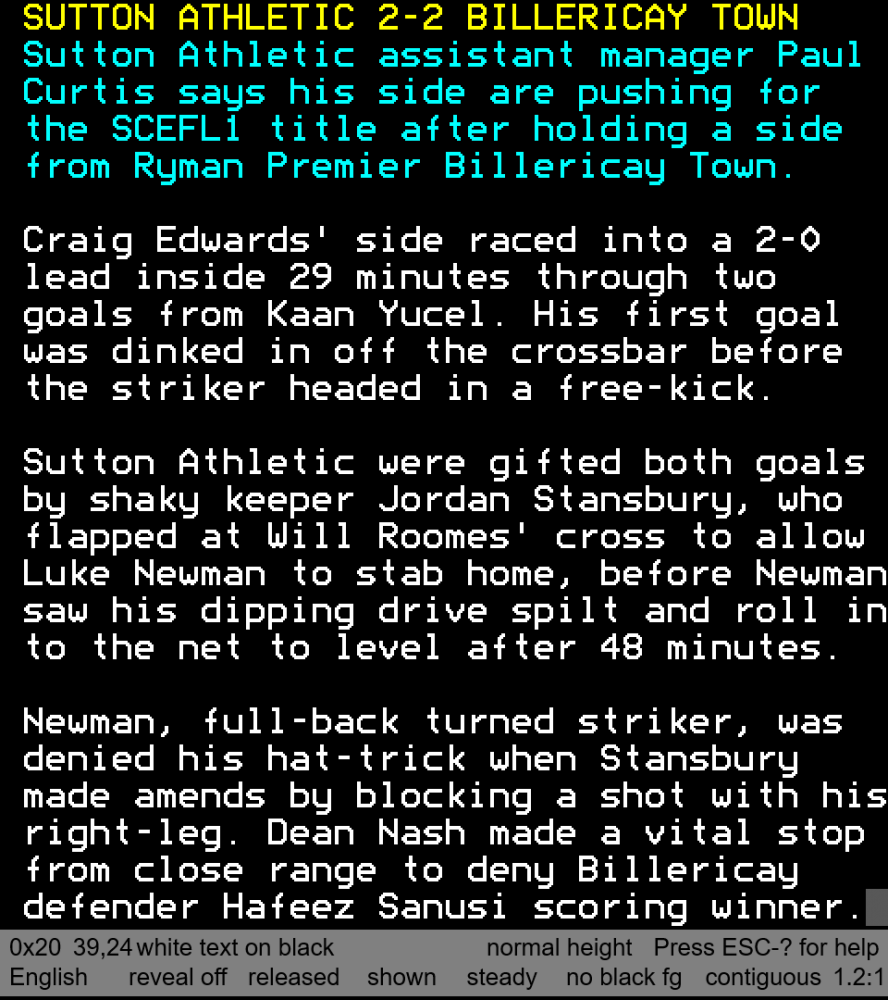 Sutton Athletic central defender Page clipped the ball which split open Euan Taylor-Reid and Gradi Milenge to put Newman through on goal and once inside the box he tried to find the bottom far corner, but Stansbury stuck out his right leg to make a morale boosting block.
