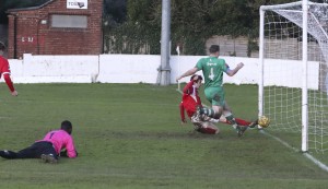 GOAL: Tom Loynes scores the equalising goal against Whyteleafe, who finished the game with three players' sent off. Photo: www.whitstabletownfc.co.uk